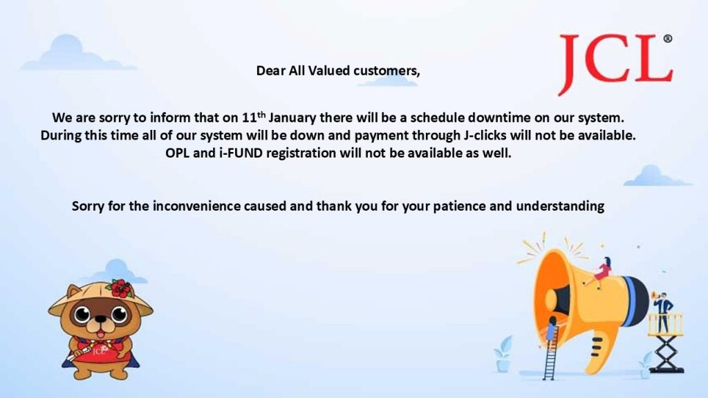 We are sorry to inform that on 11th January there will be a schedule maintenance on our system. During this time all of our system will be down and payment through J-clicks will not be available and registration for OPL and i-Fund also will not be able available. Kindly refer to the below schedule.