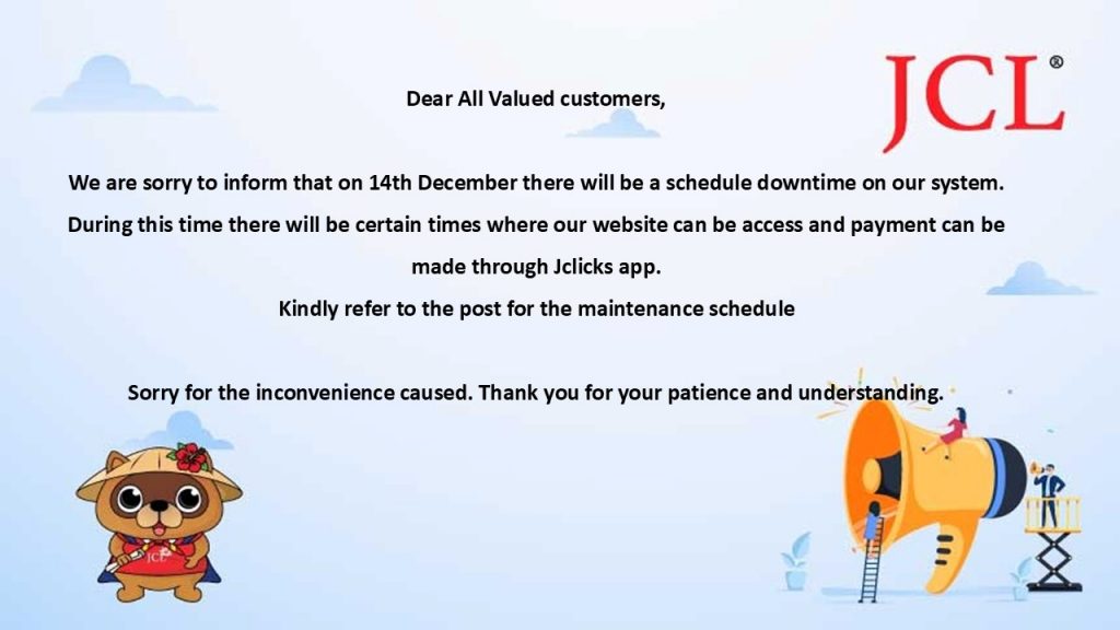 We are sorry to inform that on 14th December there will be a schedule maintenance on our system. During this time there will be certain times where our website can be access and payment can be made through Jclicks app